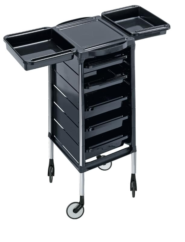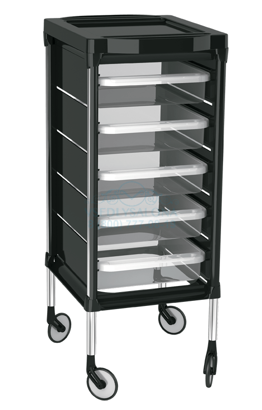 Тележка парикмахерская полузакрытого типа на колесиках. Выполнена из прочного пластика с металлическими стойками, имеет 5 выдвижных ящика. Размер (ДхШхВ): 47х43х85
